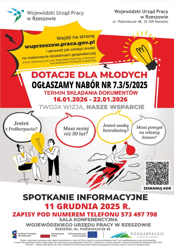 Wojewódzki Urząd Pracy w Rzeszowie ogłasza nabór nr 7.3/5/2025 do projektu pt. „Aktywizacja zawodowa osób młodych bezrobotnych w wieku 18-29 lat, wsparcie rozwoju przedsiębiorczości” w ramach Priorytetu 7 – Kapitał ludzki gotowy do zmian, Działania 07.03 Aktywizacja osób młodych pozostających bez pracy/wsparcie rozwoju przedsiębiorczości programu regionalnego Fundusze Europejskie dla Podkarpacia 2021-2027.