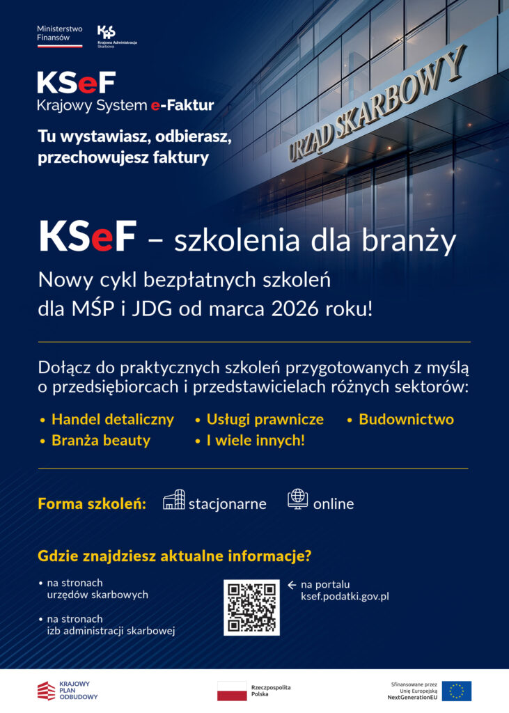 W ramach akcji KSeF – szkolenia dla branży, w województwie podkarpackim są organizowane bezpłatne szkolenia dla przedsiębiorców z poszczególnych branż. W urzędach skarbowych odbywają się one w formule stacjonarnej i online. Szczegółowe informacje znajdują się na stronach internetowych BIP Izby oraz urzędów skarbowych w zakładce: Aktualności/Środy z KSeF. Szkolenia odbywają się w każdą środę od 4 marca do 29 kwietnia 2026 r. o godz. 10:00 we wszystkich urzędach skarbowych woj. podkarpackiego (w wyłączeniem Podkarpackiego Urzędu Skarbowego w Rzeszowie).